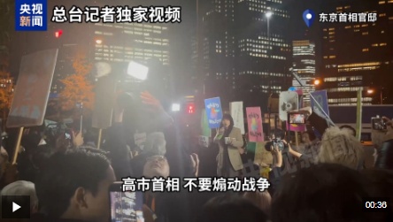 当地时间21日晚,数百名日本人聚集在东京首相官邸前,举行自发集会,要求日本首相高市田苗收回涉台不实言论。